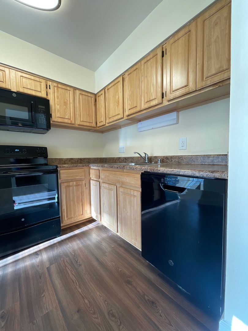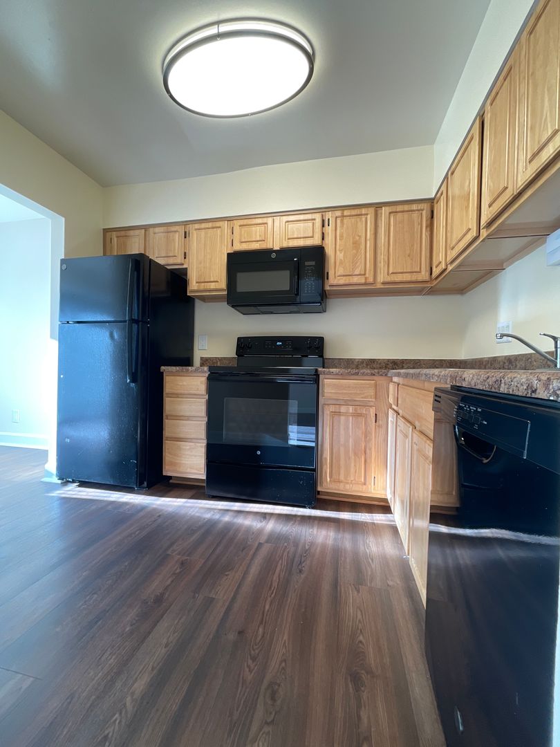 Black appliances with granite counter top & flooring in dining room area.